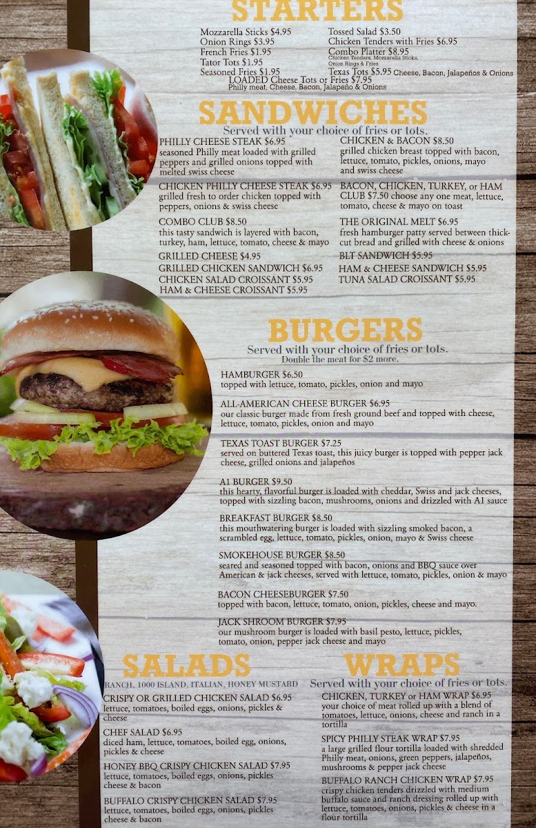 This hearty, flavorful burger is loaded with cheddar, swiss and jack cheeses, topped with sizzling bacon, mushrooms, onions and drizzled with A1 sauce.